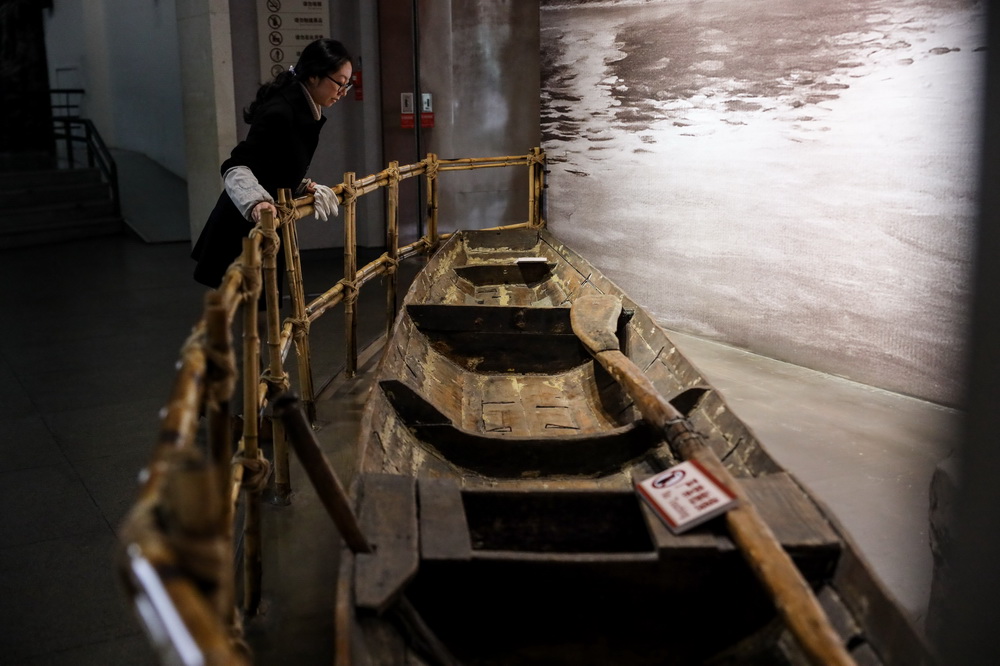 工作人員在遵義會議陳列館內查看紅軍南渡烏江時使用的木船(1月26日攝)。新華社記者 歐東衢 攝