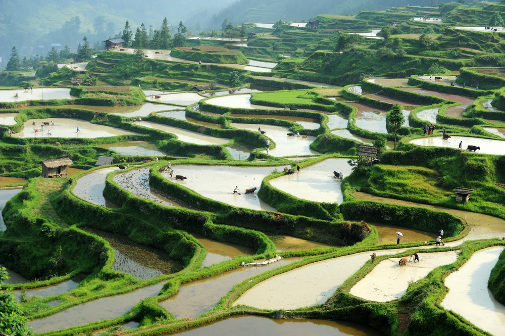 月亮山層層疊疊的梯田間,農耕時節家家戶戶下田開犁,大地鋪開一幅古老農耕文明畫卷,綠水青山成了農民的金山銀山。