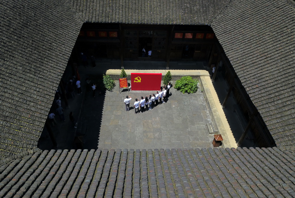 前來參觀的干部職工在貴州省甕安縣猴場會議會址重溫入黨誓詞(2019年7月3日攝,無人機照片)。新華社記者 楊文斌 攝
