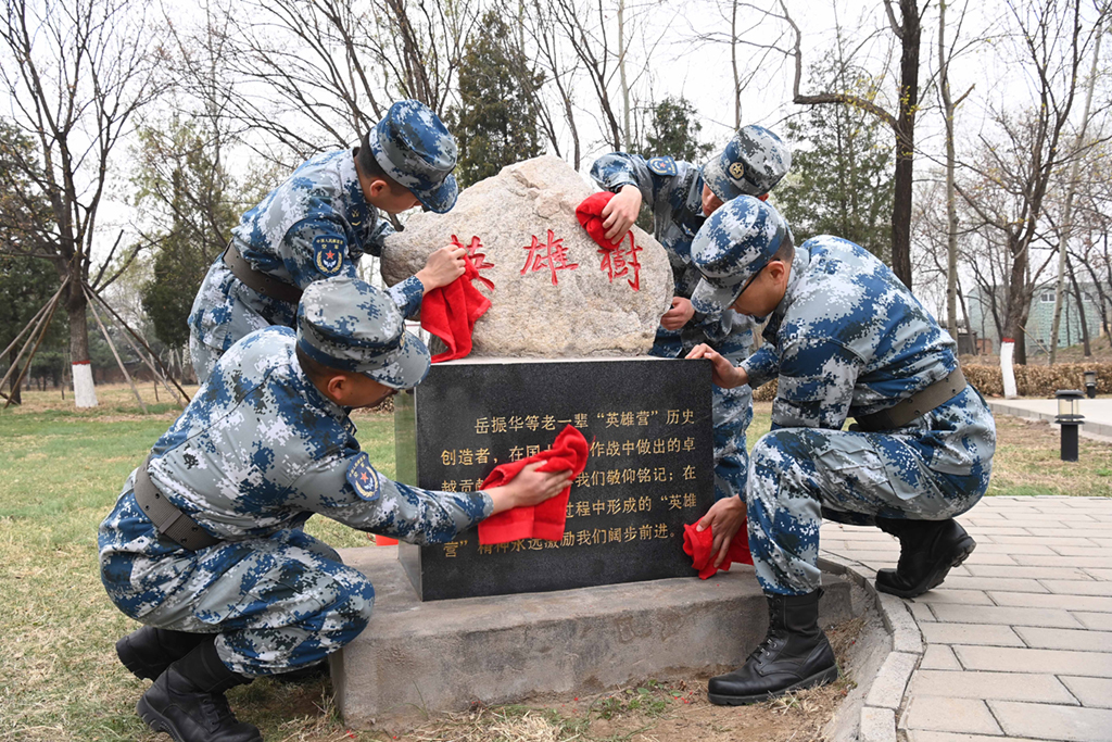 中部戰區空軍地空導彈某旅“英雄營”官兵在擦拭“英雄樹”石碑(4月1日攝)。新華社發(劉川 攝)