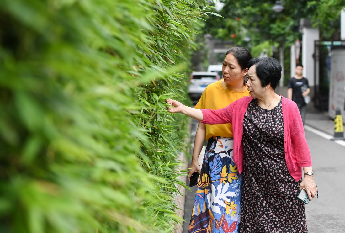 林丹(右)和軍門社區黨委副書記謝榕在社區檢查景觀綠植等工作(6月23日攝)。新華社記者 林善傳 攝