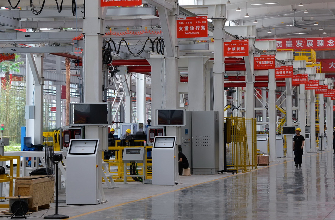 機器人往來穿梭,一臺臺工程機械生產完成。