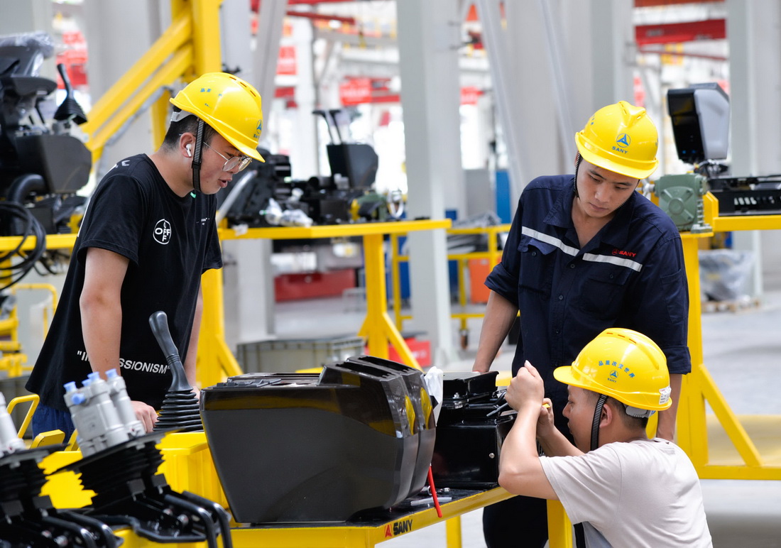 工人在位于重慶兩江新區的三一集團西南地區首個智能化“燈塔工廠”項目內作業(7月19日攝)。新華社記者 徐欽 攝