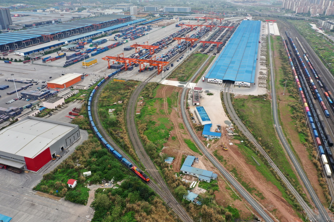 中歐班列(渝新歐)十周年紀念專列從重慶團結村站發出(3月19日攝,無人機照片)。新華社記者 唐奕 攝