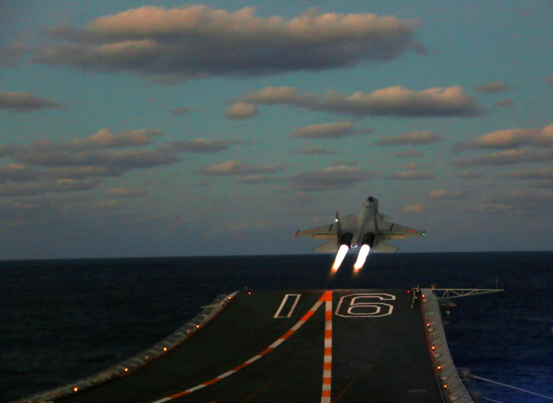 海軍遼寧艦編隊遠海實戰化訓練期間,殲-15艦載戰斗機進行夜間起降訓練(資料照片)。新華社發(張凱 攝)