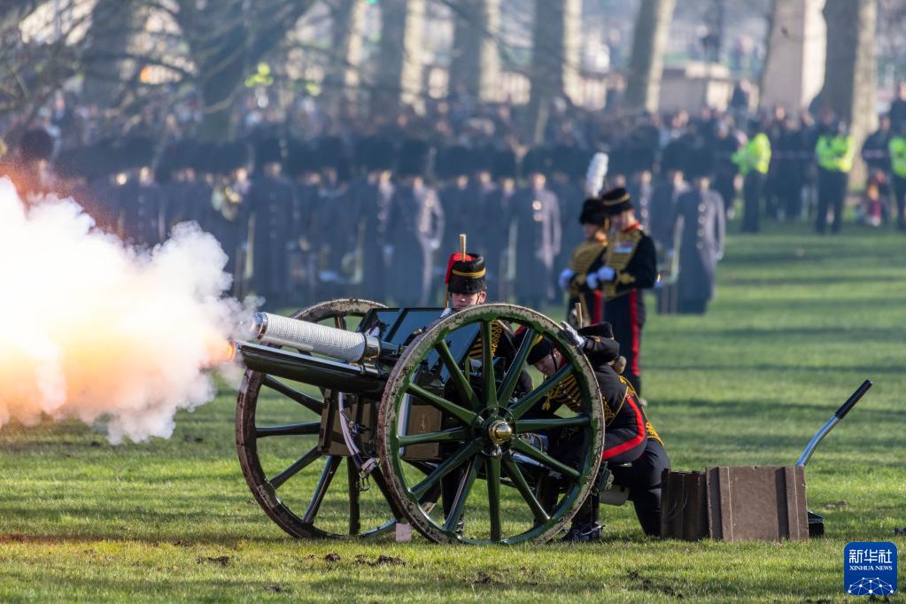 2月7日,英國士兵在倫敦白金漢宮旁的格林公園鳴放禮炮,慶祝女王伊麗莎白二世登基70周年。