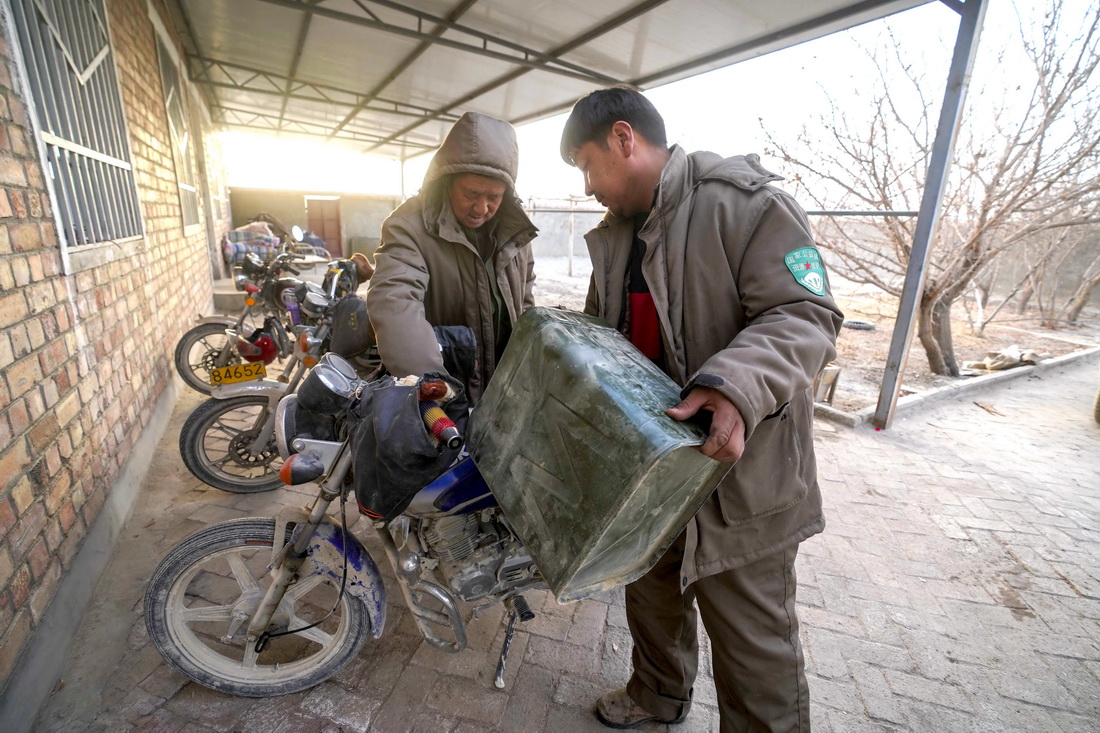 在國家級公益林尉犁縣營盤管護站,巡護前,站長外力·吾斯曼(左)和同事在往摩托車里倒入燃料(2月21日攝)。新華社記者 趙戈 攝