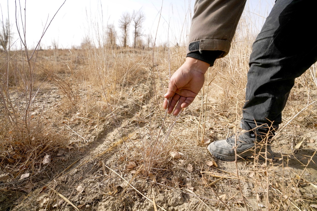 在國家級公益林尉犁縣營盤管護站,站長外力·吾斯曼俯身指著地上一叢叢像紅柳枝條的小苗介紹說,之前渴死的老胡楊,只要有水,就會從根上長出幼苗(2月21日攝)。新華社記者 趙戈 攝