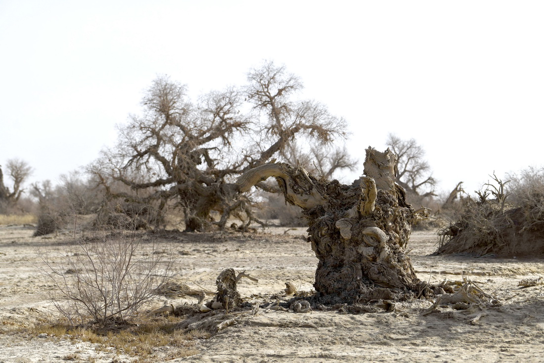 在尉犁縣塔里木河老河道附近,干死的胡楊旁又長出了新的胡楊(2月23日攝)。新華社記者 趙戈 攝