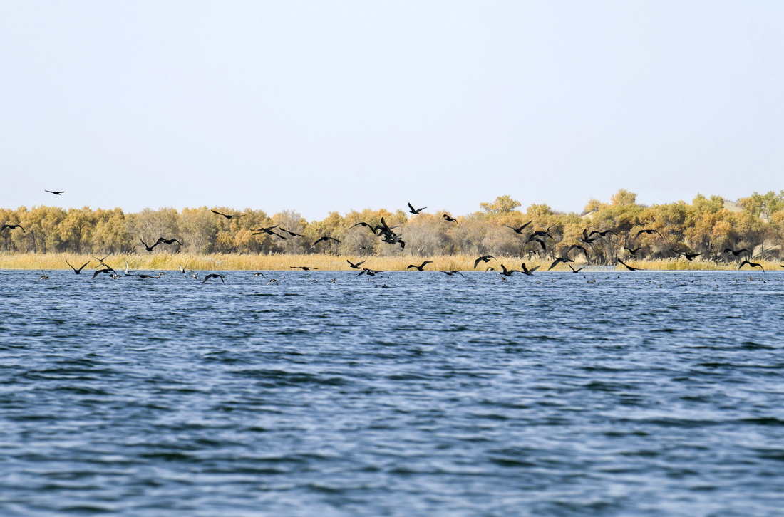 在國家級公益林尉犁縣羅湖羅克管護站,鳥兒在一處海子上空飛翔(2021年10月27日攝)。新華社記者 趙戈 攝
