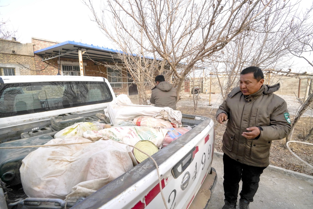 尉犁縣國有林管理局負責人艾力·尼亞孜來到國家級公益林尉犁縣營盤管護站,給護林員們送來了蔬菜和糧油(2月20日攝)。新華社記者 趙戈 攝