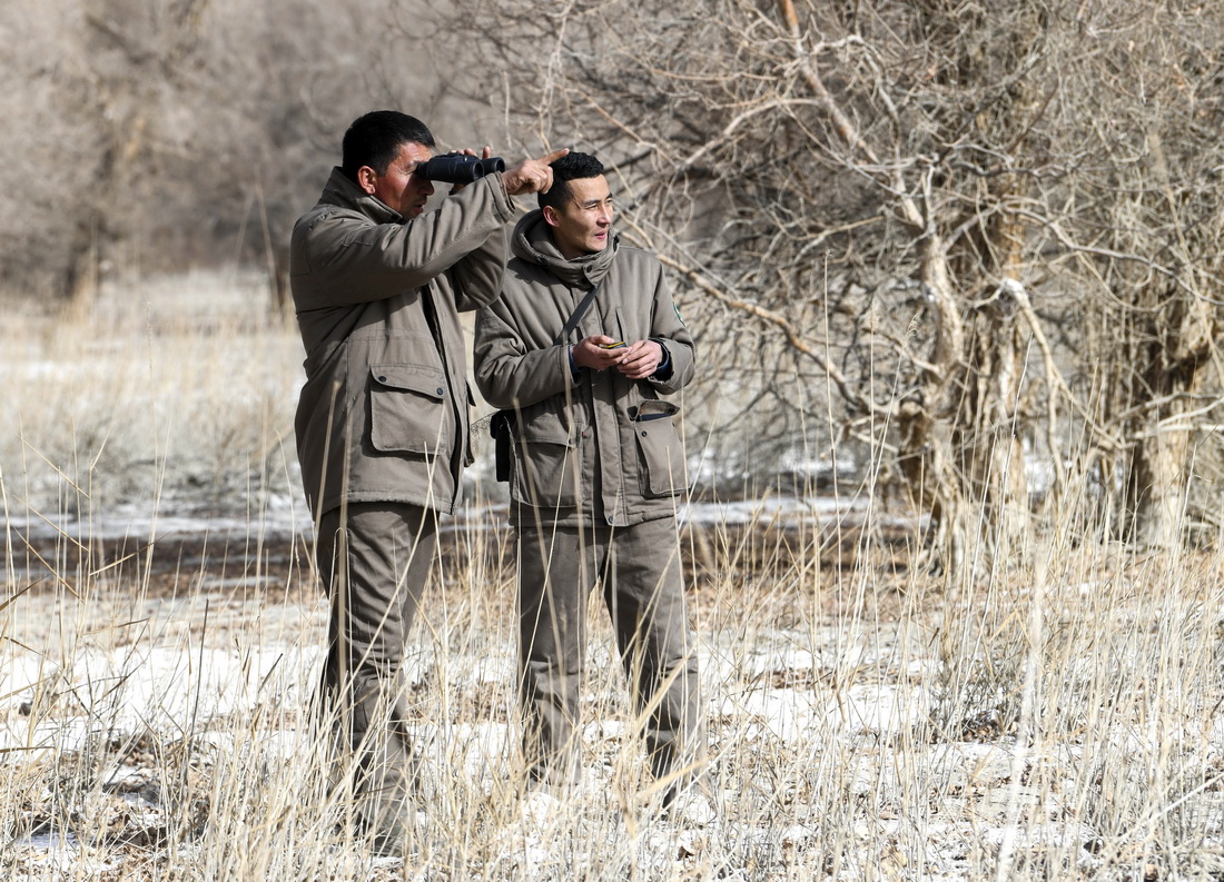 在國家級公益林尉犁縣羅湖羅克管護站,從新疆農業大學畢業的吾買爾·熱合曼(右)和同事在巡護胡楊(2月22日攝)。新華社記者 趙戈 攝