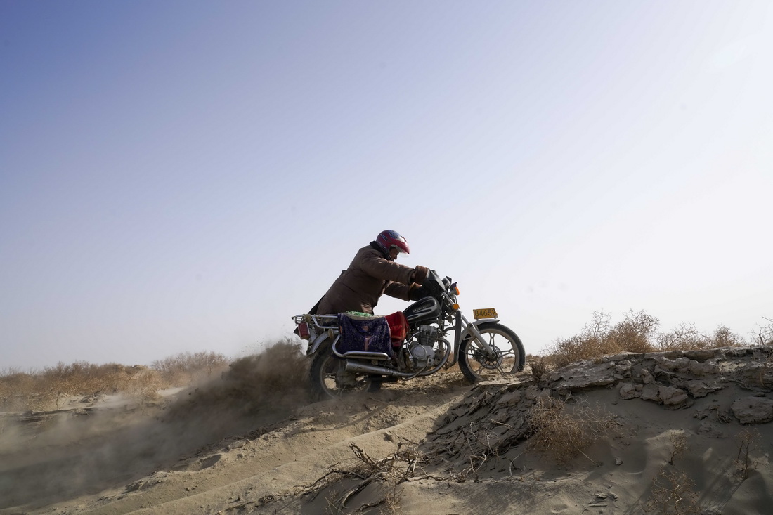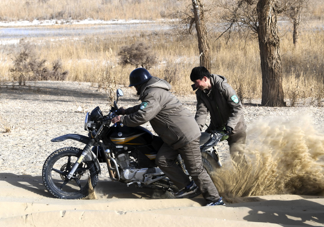 在國家級公益林尉犁縣營盤管護站,站長外力·吾斯曼手推摩托車在翻越一處小沙丘(2月21日攝)。新華社記者 趙戈 攝