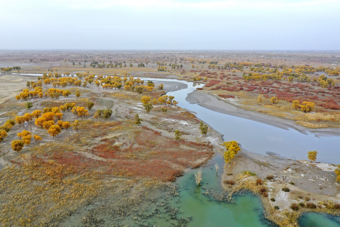 從空中俯瞰塔里木河下游一處胡楊林(2021年10月21日攝,無人機照片)。新華社記者 趙戈 攝
