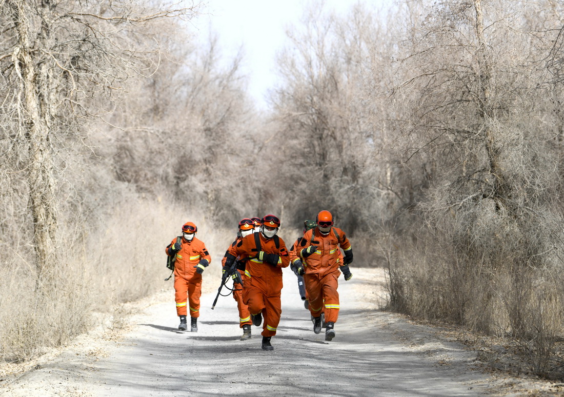 在尉犁縣一處胡楊林里,森林草原應急分隊成員在進行體能訓練(2月22日攝)。新華社記者 趙戈 攝