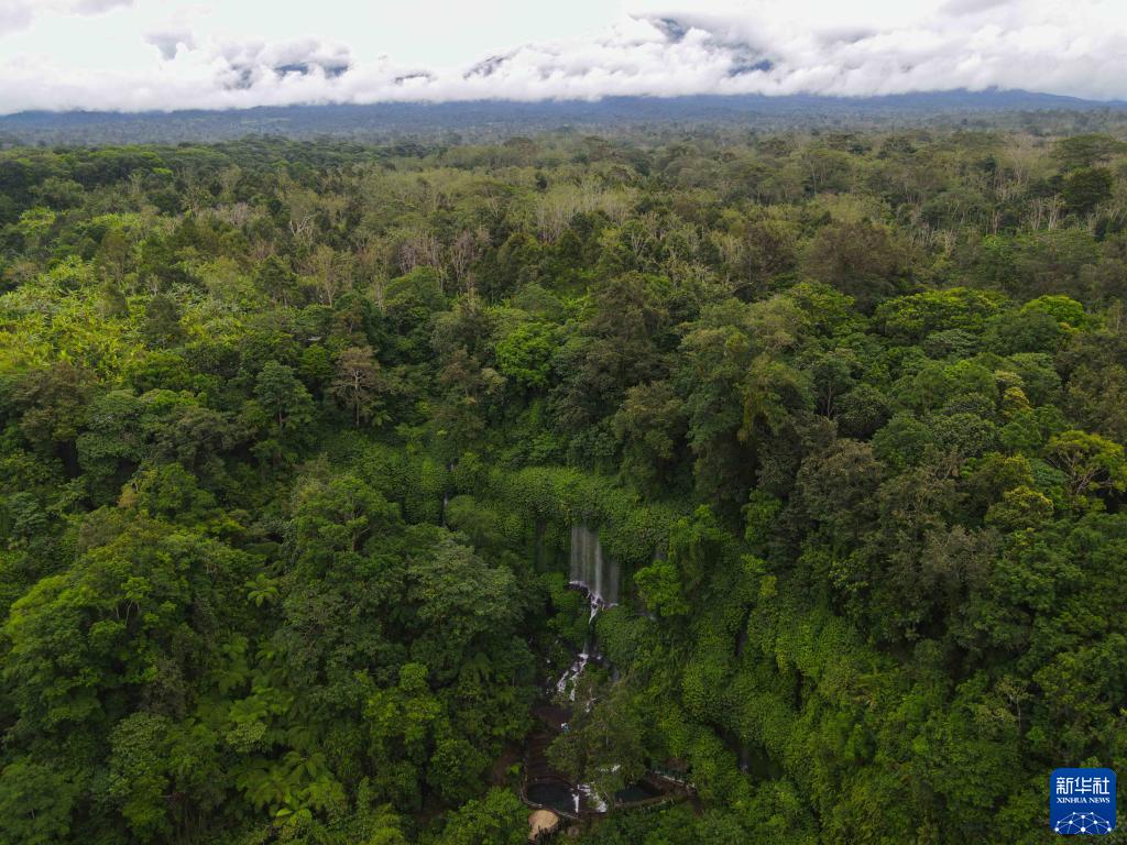 這是3月19日拍攝的掩映在熱帶雨林中的印度尼西亞龍目島貝南科蘭布瀑布(無人機照片)。