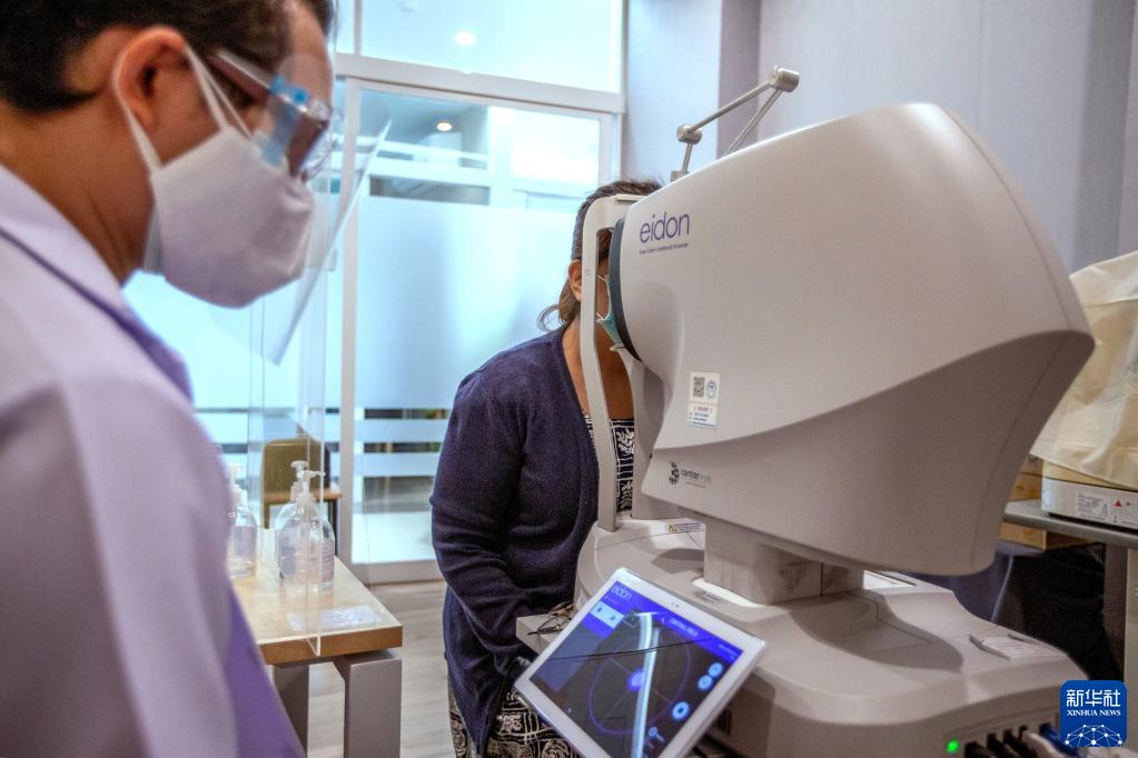 2月14日,在泰國曼谷詩里拉吉醫院,醫生操作5G自動驗光儀為患者檢查。