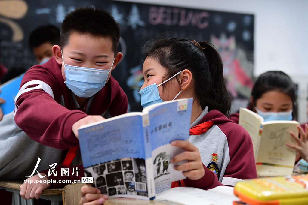 2022年4月20日,安徽合肥和平小學五(8)班召開“愛閱讀”主題班會,同學們通過好書推薦、美文齊誦、小組交流等多種形式交流讀書感受,徜徉書海、品味書香,迎接世界讀書日的到來。蔣娟娟攝(人民圖片網)