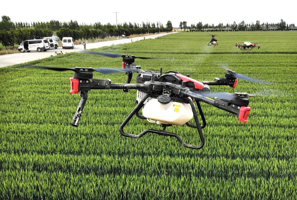 裝機、灌藥、起飛,幾架直徑一米左右的無人機在技術人員操控下盤旋爬升、空中懸停、勻速前行,霧化藥肥混合劑均勻地灑在麥苗上,僅用1分鐘就完成了1畝農田的植保任務。