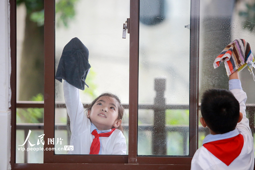 開學第一天,江蘇揚州汶河小學北柳巷校區的學生在清潔教學樓的玻璃窗。孟德龍攝(人民圖片網)
