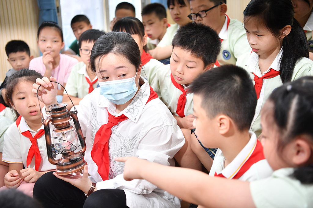 開學第一天,江西南昌八一起義紀念館講解員走進南昌市珠市學校珠寶校區,給孩子們講述八一起義“一盞馬燈”的紅色故事。人民網 時雨攝