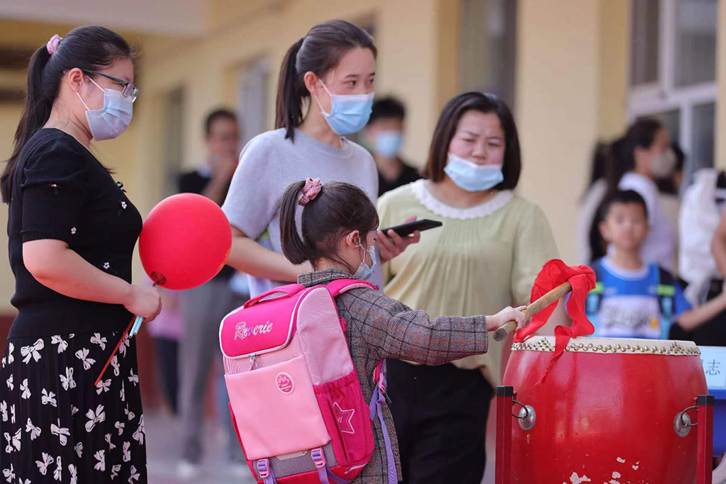 開學第一天,河北省邢臺市廣宗縣第六小學,一年級新生在擊鼓明志。人民網 趙明妍攝