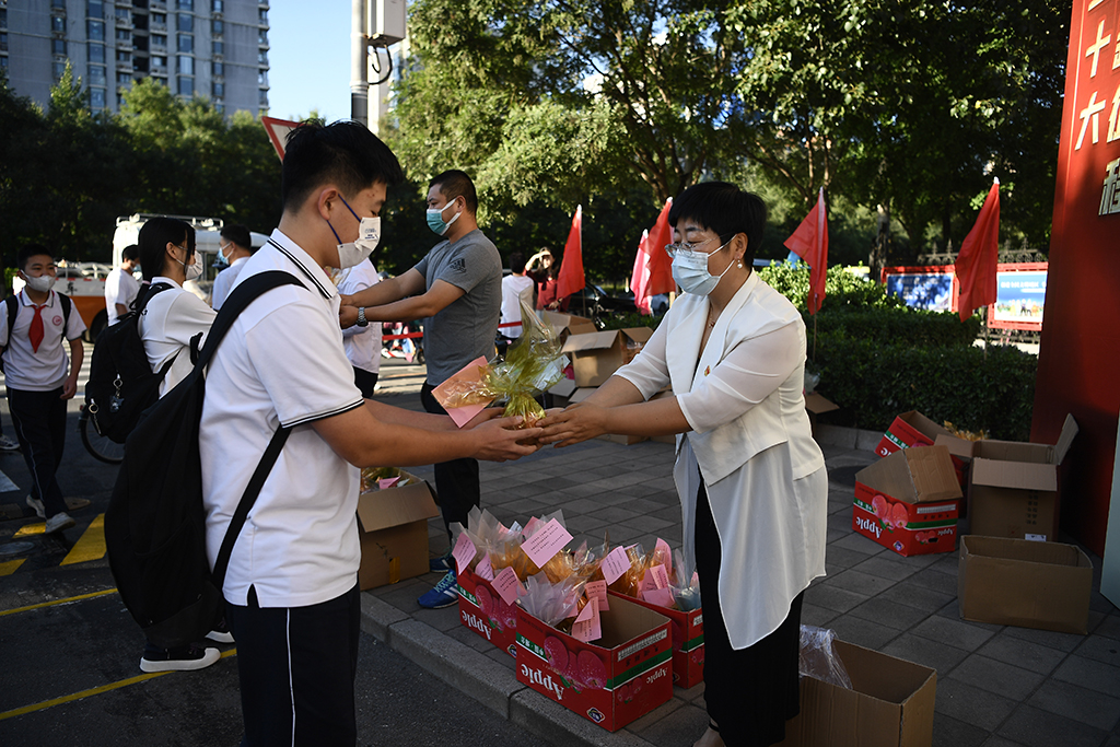 開學第一天,北京石景山首師大附屬蘋果園中學,老師給學生送蘋果。人民網記者 于凱攝
