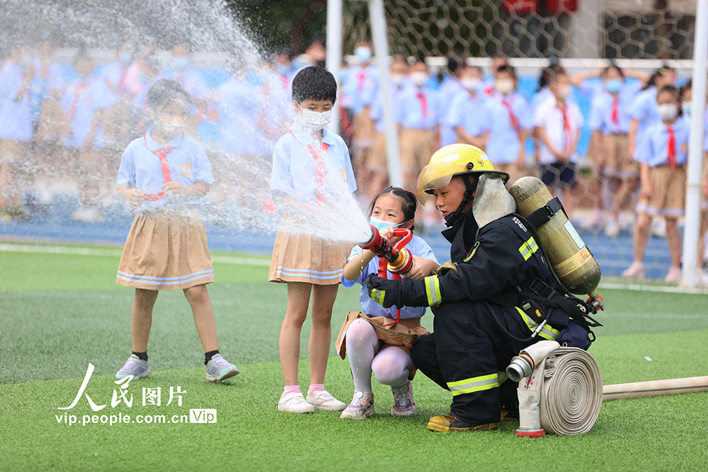 開學第一天,福建廈門金安小學,小學生在消防員的指導下體驗手持水槍“滅火”。曾德猛攝(人民圖片網)