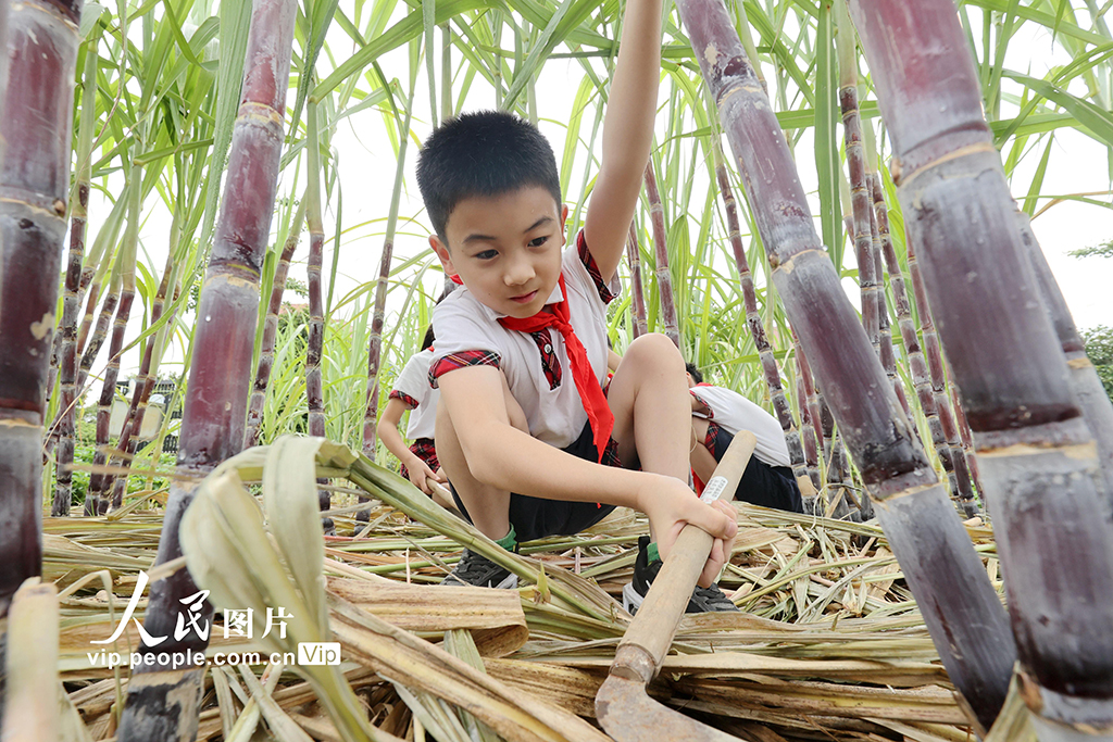 開學第一天,浙江湖州德清縣雷甸鎮中心小學學生在校園農場收割甘蔗。謝尚國攝(人民圖片網)