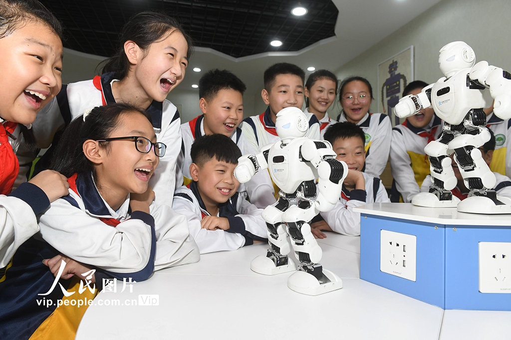 開學第一天,安徽阜陽潁東區和諧路小學的小學生在創客室內觀看機器人表演“功夫”。王彪攝(人民圖片網)