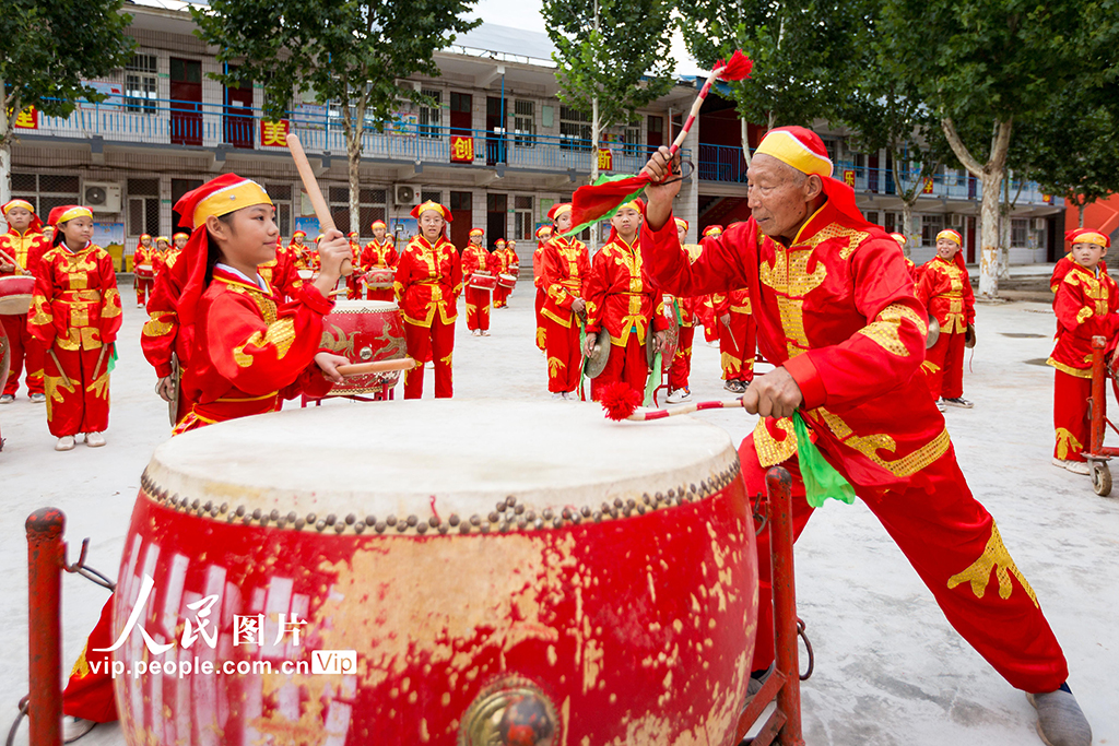 開學第一天,河南安陽呂村集小學,省級非物質文化遺產呂村戰鼓傳承人付同喜(右一)在學校操場上向同學們示范戰鼓基本動作。王建安攝(人民圖片網)