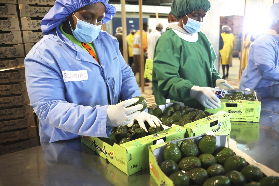 2022年8月2日,在位于肯尼亞利穆魯鎮的桑瑞普工廠,員工將牛油果裝箱。桑瑞普工廠當日舉行鮮食牛油果對華出口首發儀式,這是非洲鮮食牛油果首次出口中國。新華社記者 董江輝 攝