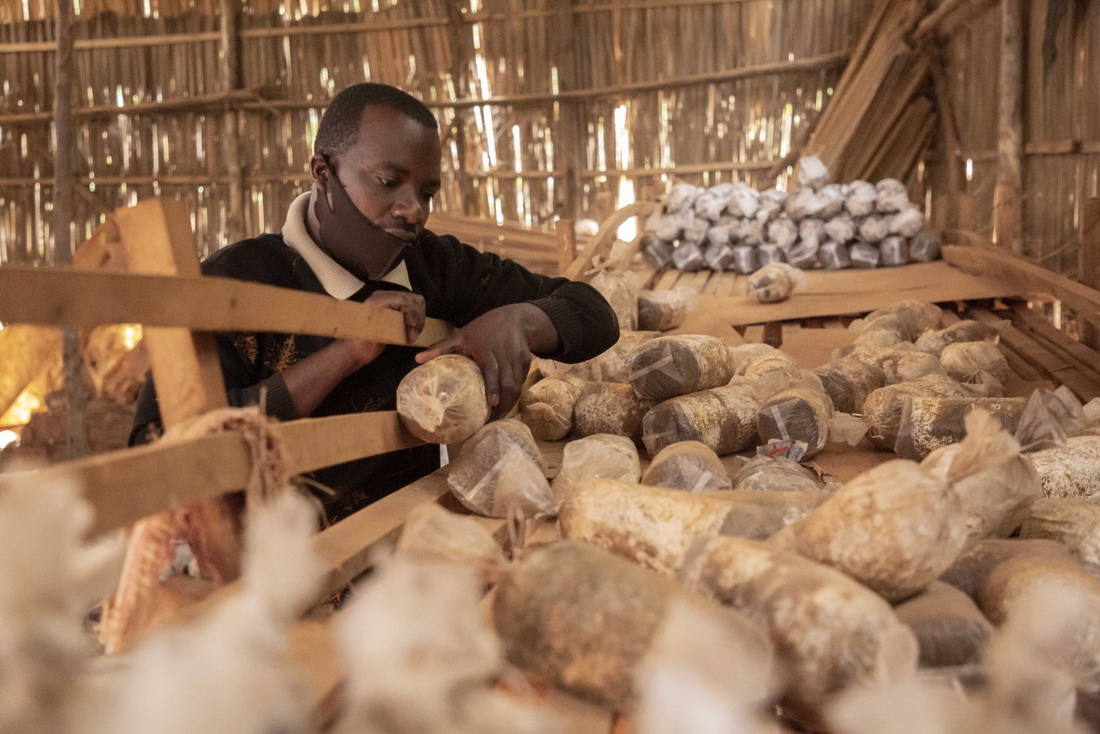 2020年9月9日,在盧旺達首都基加利的一家食用菌培育作坊,作坊主人埃馬紐埃爾·阿希馬納檢查菌袋。中國福建農林大學的菌草專家2006年來到盧旺達開始菌草技術合作項目,在當地示范和推廣菌草技術!袄镁菁夹g種植食用菌,在盧旺達現在可是一項利潤豐厚的生意,這對人們擺脫貧困很有幫助,”曾經為全家衣食煩心的阿希馬納說,“我有4個孩子,菌草技術帶來的收入,除去孩子學費和生活開支,我還能存下一些資金繼續壯大自己的生意。中國人的菌草技術,讓我和其他很多人受益!新華社發(西里爾·恩德格亞攝)