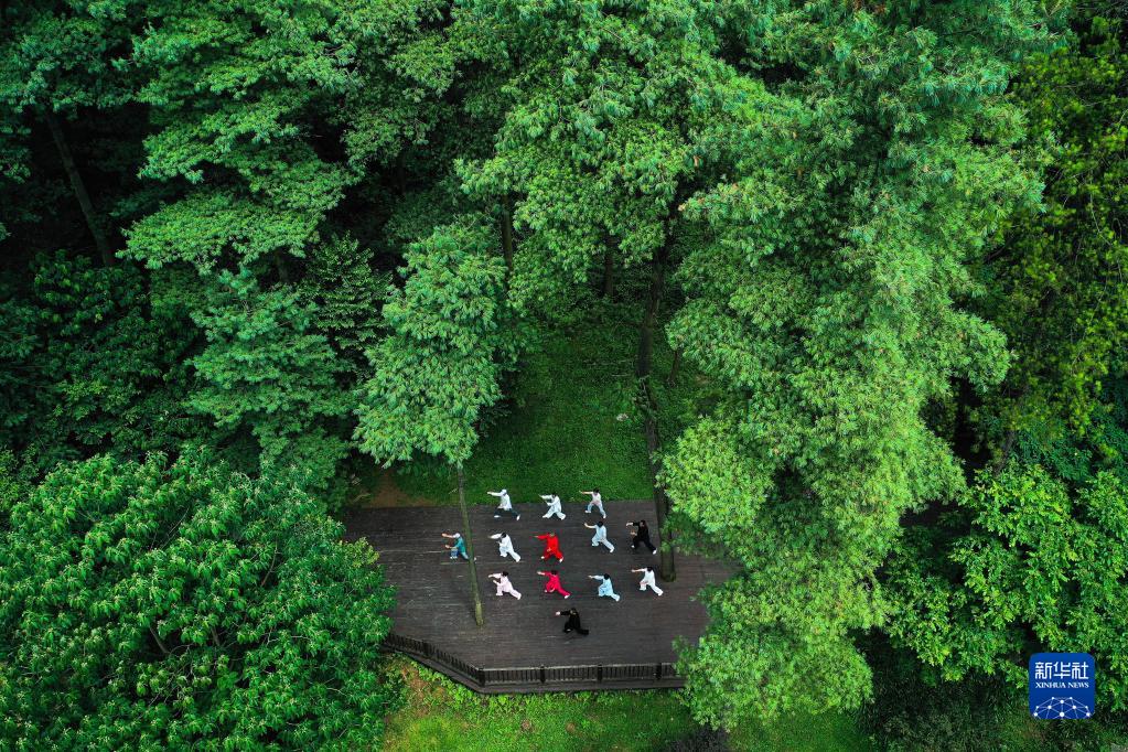 市民在貴陽市長坡嶺國家級森林公園里健身(2022年7月13日攝,無人機照片)。新華社記者 楊文斌 攝