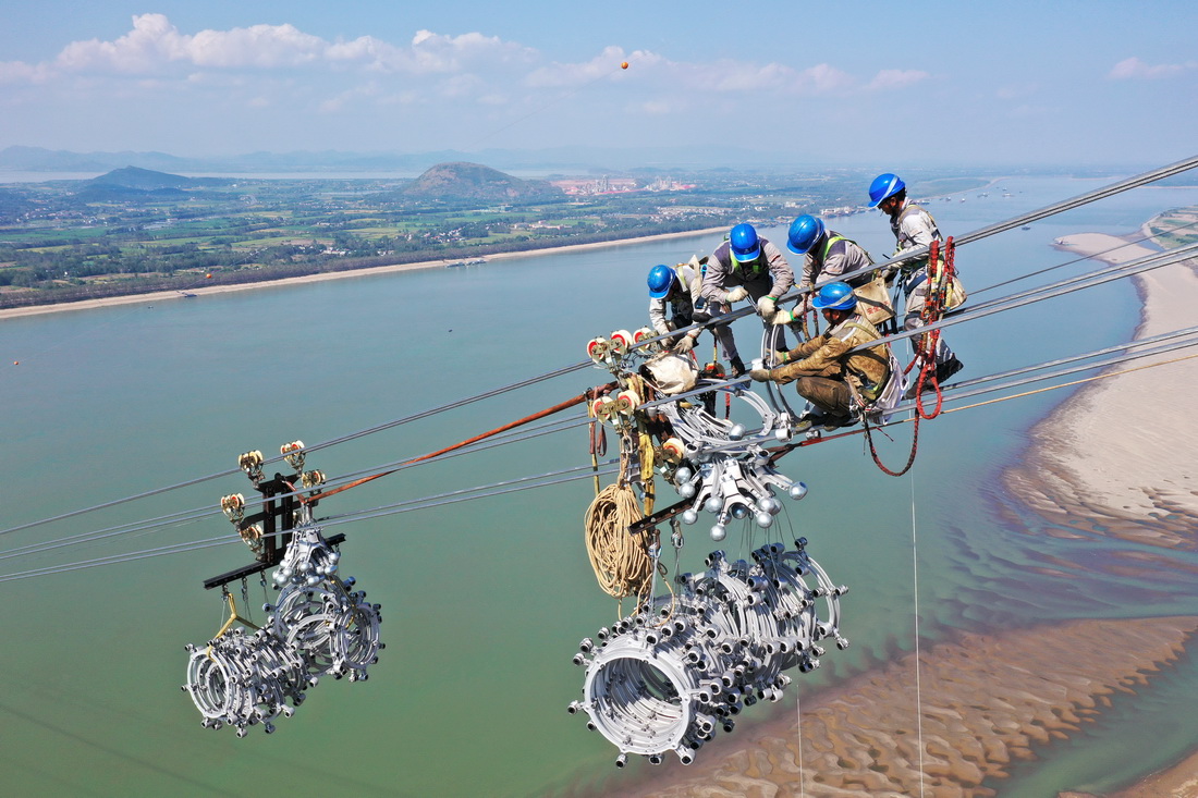2022年9月16日,白鶴灘至浙江±800千伏特高壓直流輸電工程(白浙線)安徽段順利完成長江大跨越放線作業。白浙線是我國實施“西電東送”戰略的重點工程(無人機照片)。 新華社發(趙獻富 攝)