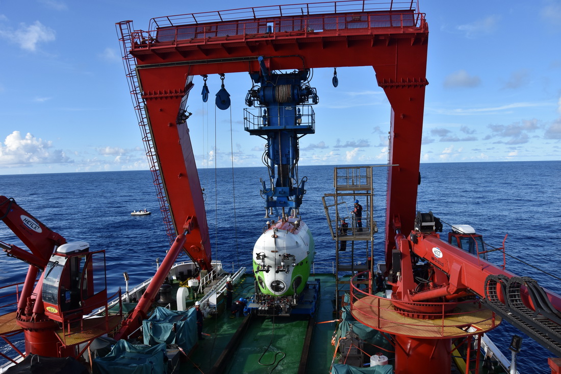 2021年8月18日,工作人員在西太平洋準備從“探索一號”科考船甲板布放“奮斗者”號。 新華社記者 陳凱姿 攝