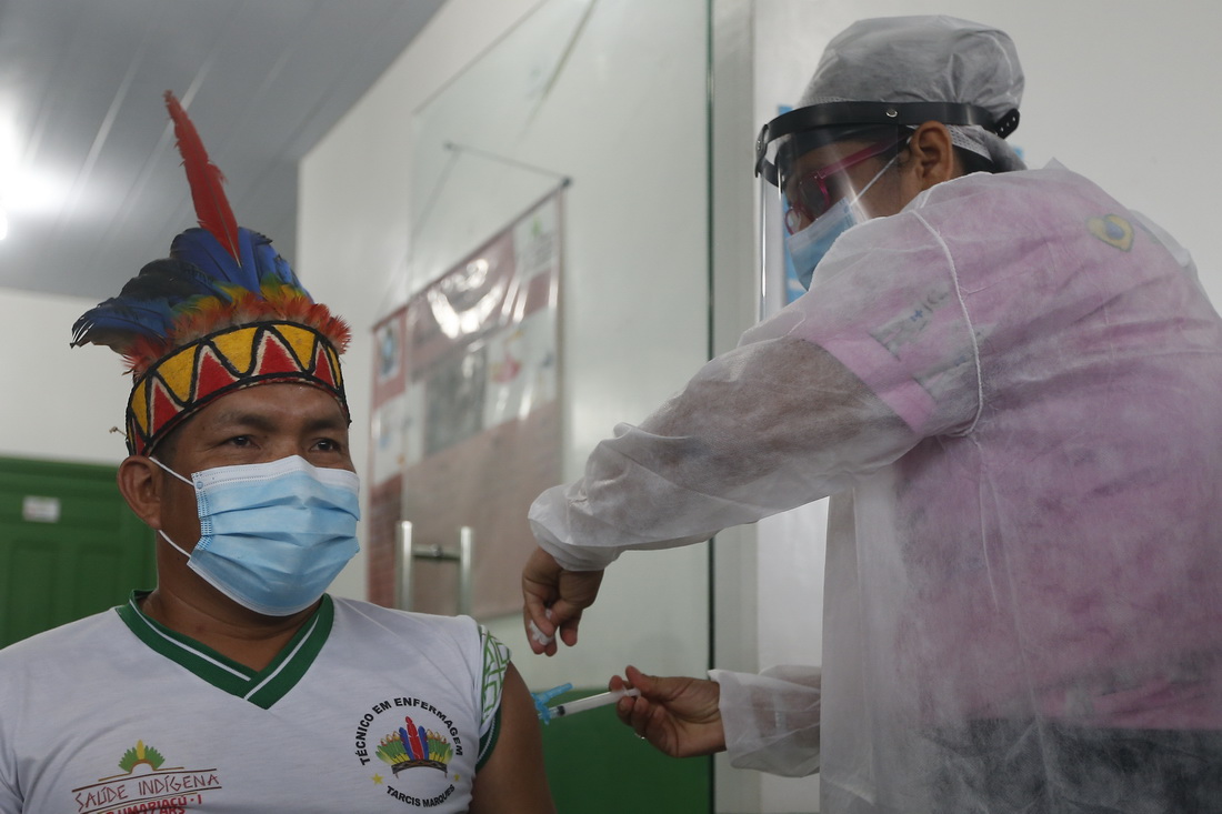 2021年1月19日,醫護人員在巴西亞馬孫州塔巴廷加市為一名原住民接種中國新冠疫苗。新華社發(盧西奧·塔沃拉攝)