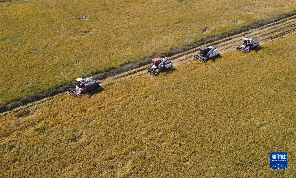 10月11日,在安徽省蕪湖市繁昌區新港鎮,村民駕駛收割機收割水稻(無人機照片)。