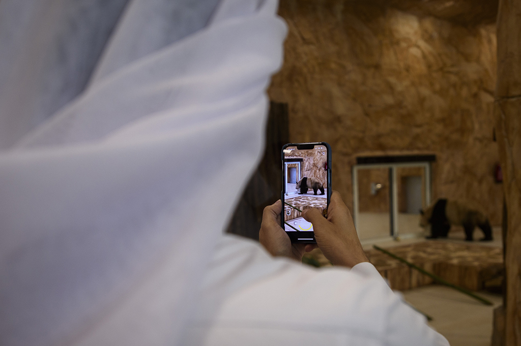 10月19日,一名男子在卡塔爾首都多哈的豪爾熊貓館拍攝大熊貓。新華社發(尼庫攝)