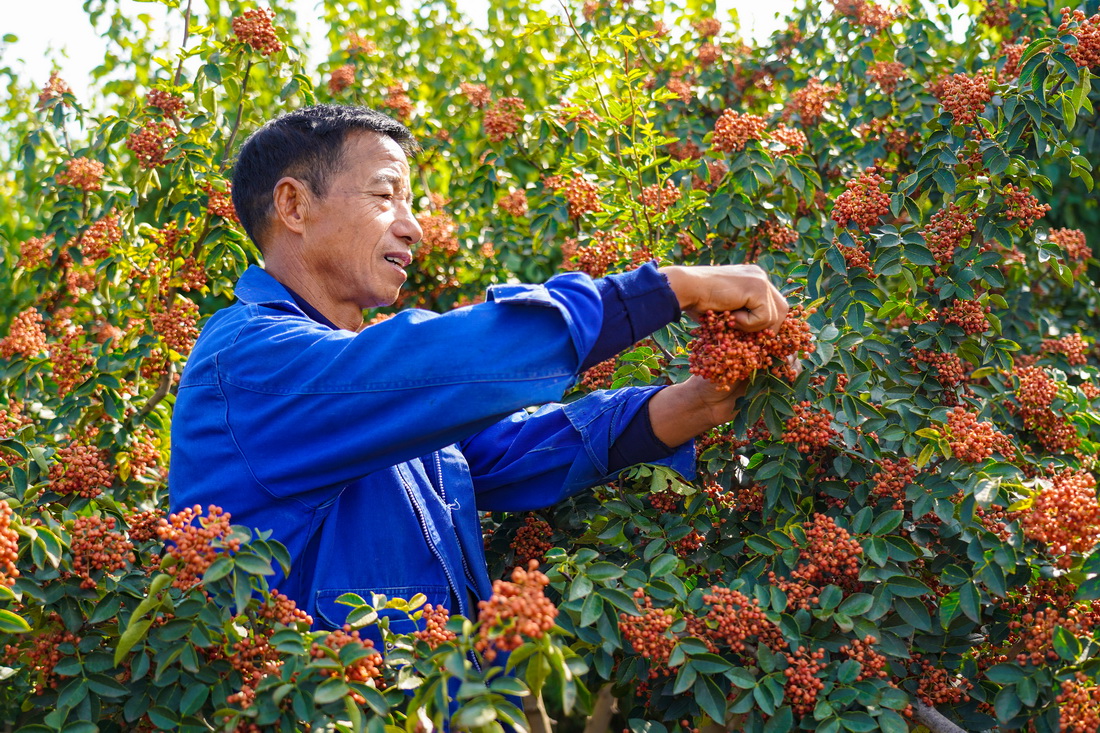 在山西省運城市芮城縣風陵渡鎮,椒農在采摘花椒(2022年8月31日攝)。新華社發
