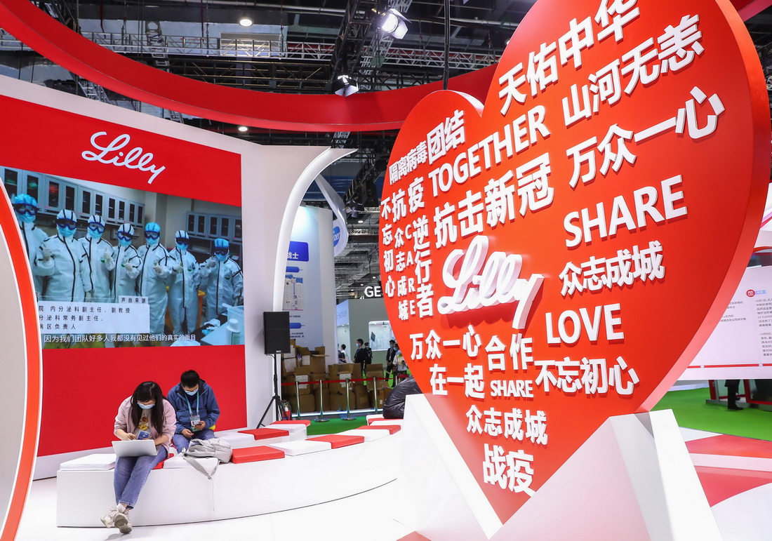 在第三屆中國國際進口博覽會公共衛生防疫專區拍攝的禮來展臺(2020年11月6日攝)。新華社記者 張玉薇 攝