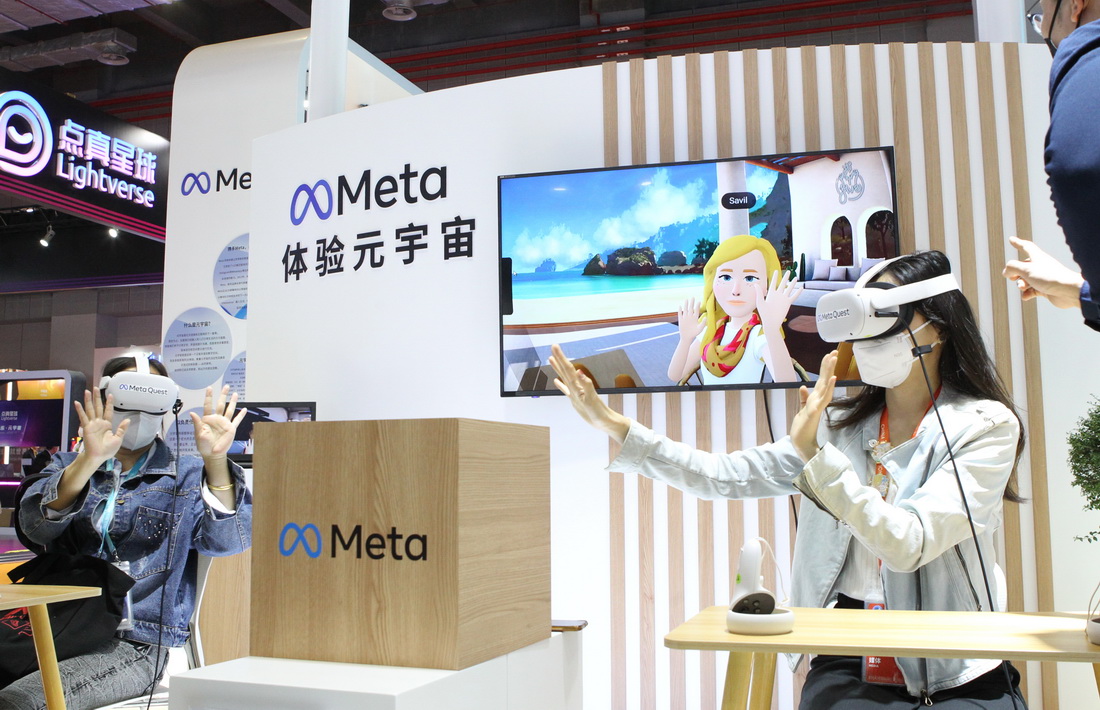 2022年11月7日,在第五屆進博會技術裝備展區的人工智能專區,體驗者借助VR頭戴設備感受在虛擬工作空間“隔空擊掌”。新華社記者 侯俊 攝