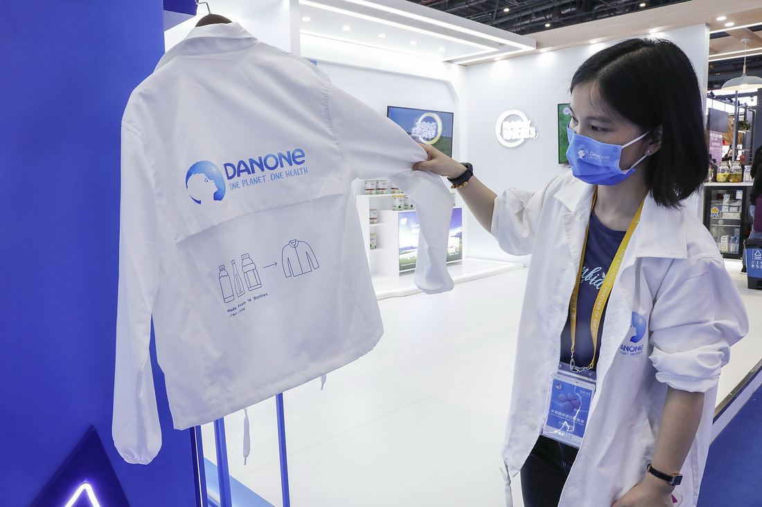 在第四屆中國國際進口博覽會食品和農產品展區達能展臺,工作人員展示用塑料飲料空瓶制造的外套(2021年11月6日攝)。新華社記者 張玉薇 攝