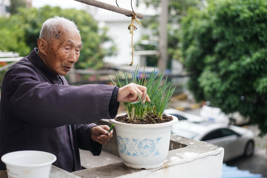 龔德年在摘蔥,準備做午飯(4月29日攝)。