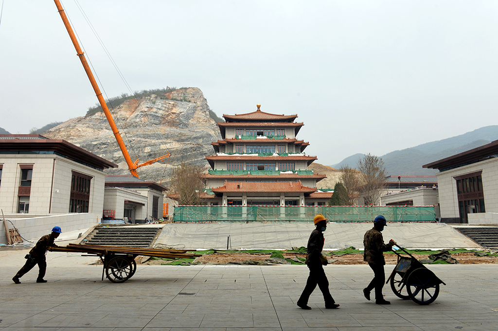 4月11日,施工工人從建設中的文瀚閣前走過。人民網記者 陳斌攝