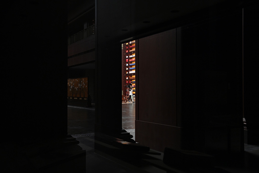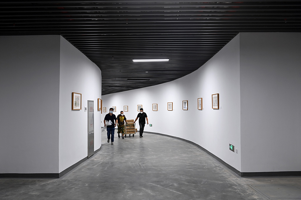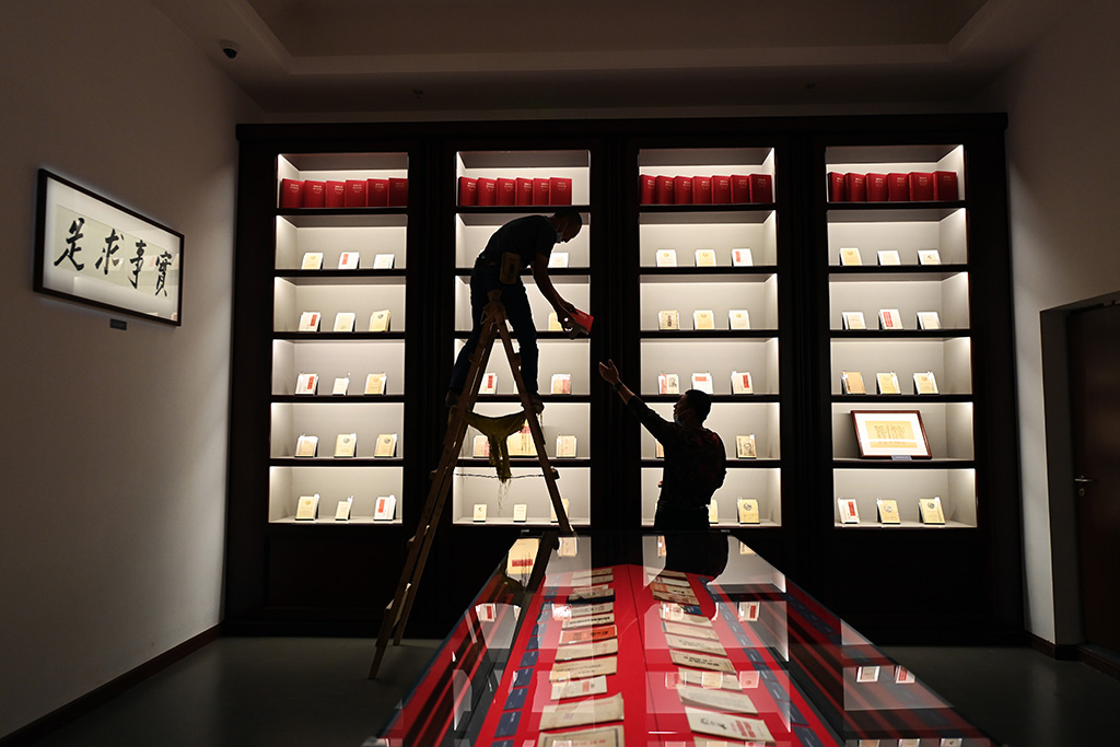 9月28日,中央總館“真理之光”展區,工作人員在調整展陳。人民網記者 陳斌攝