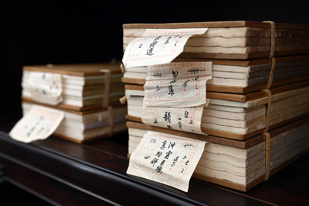 中央總館設立“淵溯津瀾——《四庫全書》文瀚合璧”古籍展,首次同臺展示文淵閣、文溯閣、文津閣、文瀾閣四閣《四庫全書》的真本和仿真影印版本,這是《四庫全書》抄寫完成后的歷史首次相聚。圖為展出的文瀾閣《四庫全書》原本。人民網記者 陳斌攝