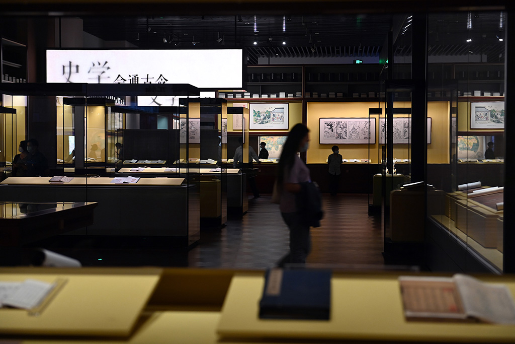 文瀚閣內陳列著珍貴的古籍出版物,集中展示《永樂大典》《古今圖書集成》等原大仿真影印本、精選古籍影印本和原雕版刷印本。人民網記者 陳斌攝