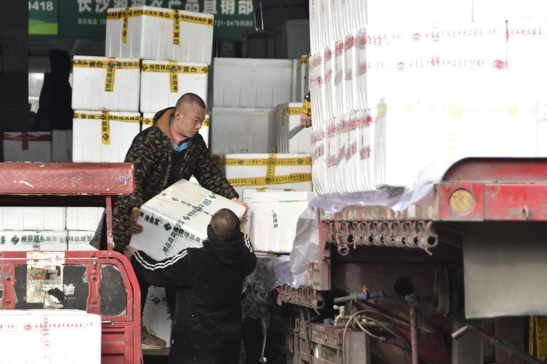長沙海吉星市場里,一輛輛掛著外地牌照的大貨車?吭诟鱾檔口,工人們忙著裝卸生鮮蔬菜,負責轉運的三輪車穿梭不停,呈現一派熱鬧的景象。