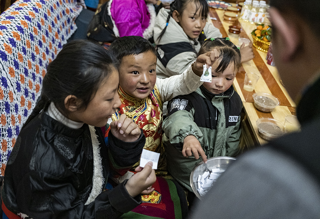 在位于森布日安置點的家中,石秀次仁家的孩子們在向家人展示自己隨機拿取的小紙條。畫在紙條上的圖案有著不同的寓意(2月19日攝)。
